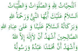 语言、身体、钱财的功课全归于真主。圣人啊!愿真主赐你平安、慈惠和吉庆。也赐于我们和一切善良的仆民平安、吉庆。我作证:除真主之外,没有应受崇拜者;我作证:穆罕默德是真主的仆民和使者。