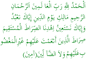 我从受驱逐的魔鬼上求主护佑,奉普慈特慈的真主之名,赞颂全归真主,全世界的主,普慈特慈的主,我们只崇拜你,只求你佑助,求你引导我们上正路,你所佑助者的路,不是受遣怒者的路,也不是迷误者的路。主啊!你准承我们的祈求吧!